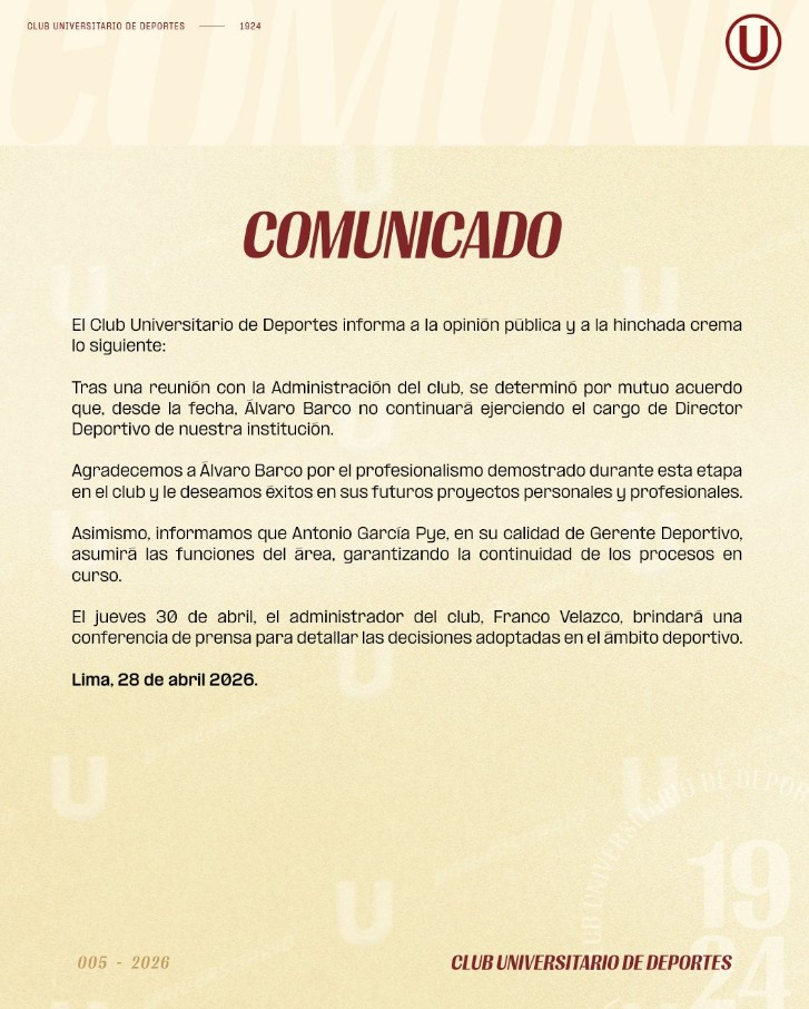 En otra parte del comunicado, el elenco estudiantil indicó que Antonio García Pye asumirá las funciones de director deportivo. Como es conocido, Universitario se encuentra buscando un nuevo entrenador tras la salida de Javier Rabanal.